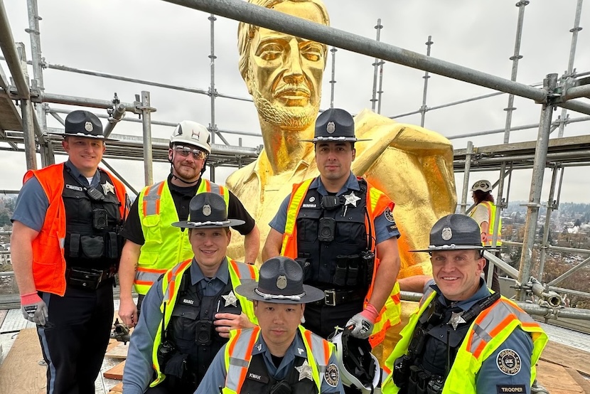Oregon – Oregon State Police troopers recently had a rare, close-up view of the state’s iconic Gold Man as scaffolding came down during the final stages of seismic upgrades and renovations to the Capitol building.
